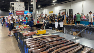 veel geweren en pistolen te bewonderen, meer of minder automatisch, en een hele rij aanbieders van munitie. Maar ook andere wapens zoals zwaarden, bijlen, en messen. Verder accessoires zoals holsters en kogelvrije vesten in allerlei soorten, kleuren en maten. Voor $60 kon je een honkbalknuppel kopen met prikkeldraad of spijkers. Ik neem aan om iemand de hersens mee in te slaan, net als een zombie. Er was ook iemand die materialen uit de 1e en 2e Wereld Oorlog stond te verkopen. En natuurlijk was er een kraampje met Donald Trump artikelen, om zijn campagne te ondersteunen. Het was een waar feest voor de liefhebber. Cowboys onder elkaar zal ik maar zeggen.